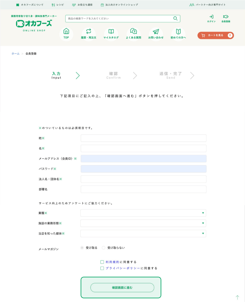 会員登録フォーム必要事項のご記入と簡単なアンケートに応えていただき、「確認画面に進む」ボタンを押してください。