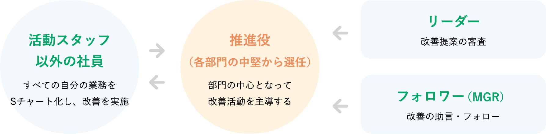 推進役や社員が活動を通して業務を改善し、学習と成長をマネージャーが応援していく体制