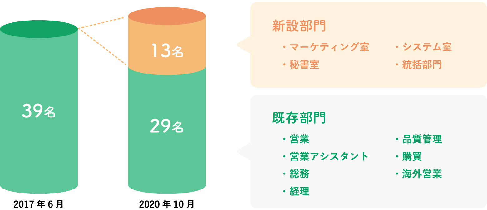 さらに部門の人員構成が変化し、社員の3割以上がマーケティング、システム、秘書などの新設部門に移動しました。