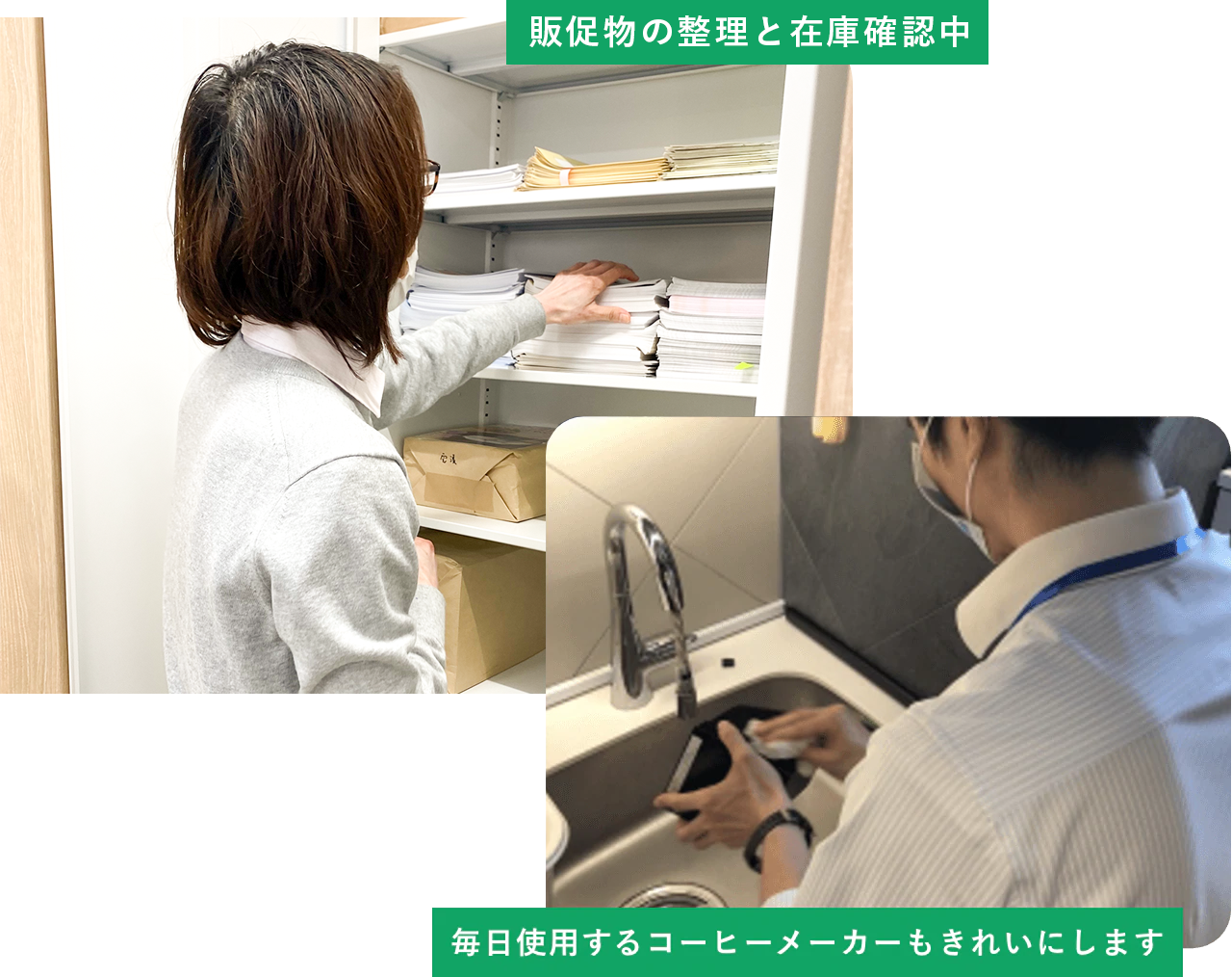 8:30から開始される全員で行うラジオ体操が終了した後、計画に沿って8時57分まで約25分間行います。環境整備はすべての活動において最優先としお客様からの電話応対を除き、「毎日」「必ず」「全員」で実行しています。また、お客様のところへ直接訪問をしたり出張などやむを得ず実行できなかった場合には、帰社後もしくは別の日に代替として環境整備を行います。