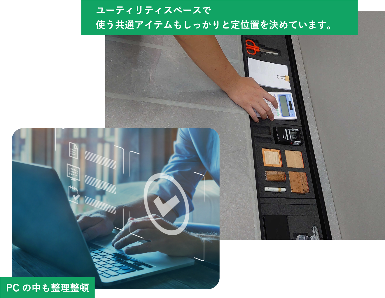 要る物と要らない物を明確にし、要るもののみを残します。無駄な仕事を探し、その仕事はデジタイズを試み、やめるようにし、書類は電子化するようにしていますパソコンの中にある不要なデータ・メール・ファイルを削除をし、定期的にアプリの更新を行い、使う人のことを考え、データの保存は、決められたルールに従い保存・管理をしています。併せて「3定」(定位置・定品・定数)を徹底して推進しています。